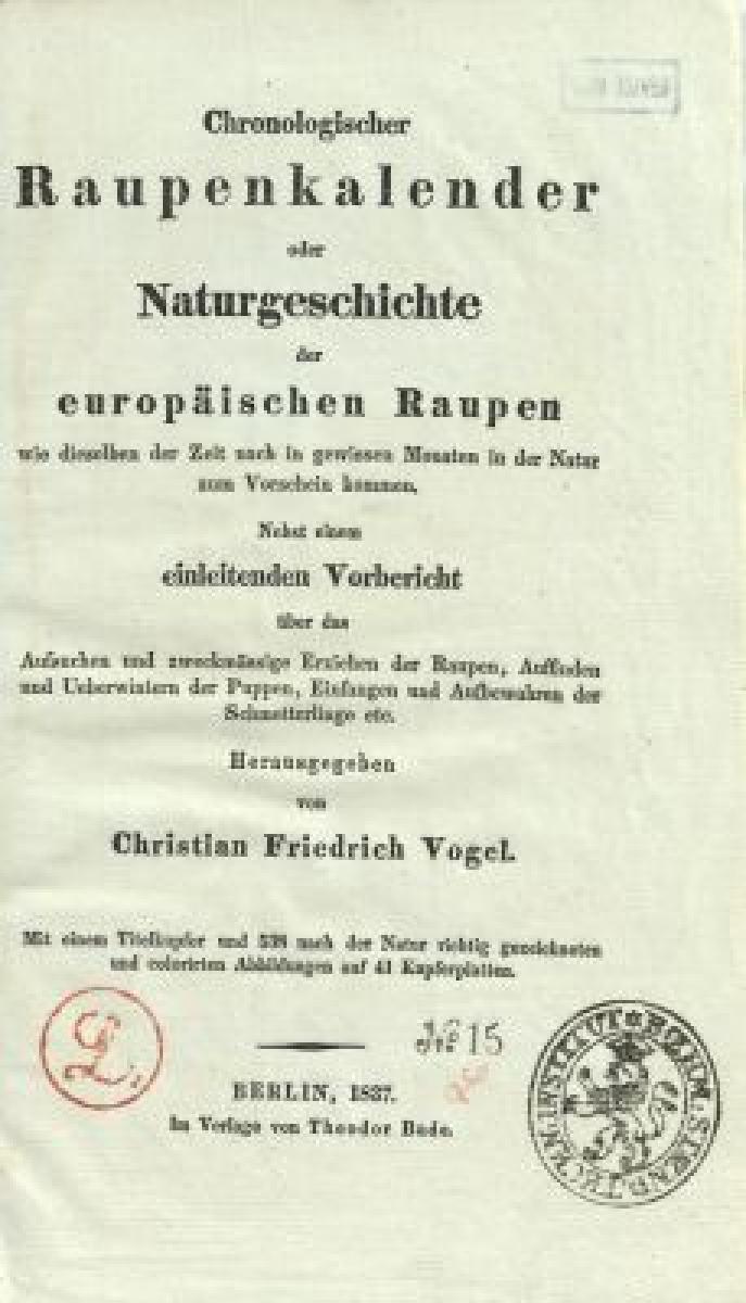 - Plný název: Chronologischer Raupenkalender, oder, Naturgeschichte der europäischen Raupen wie dieselben der Zeit nach in gewissen Monaten in der Natur zum Vorschein kommen: Nebst einem einleitenden Vorbericht über das Aufsuchen und zweckmässige Erziehen der Raupen ... Einfangen und Aufbewahren der chmetterlinge etc.