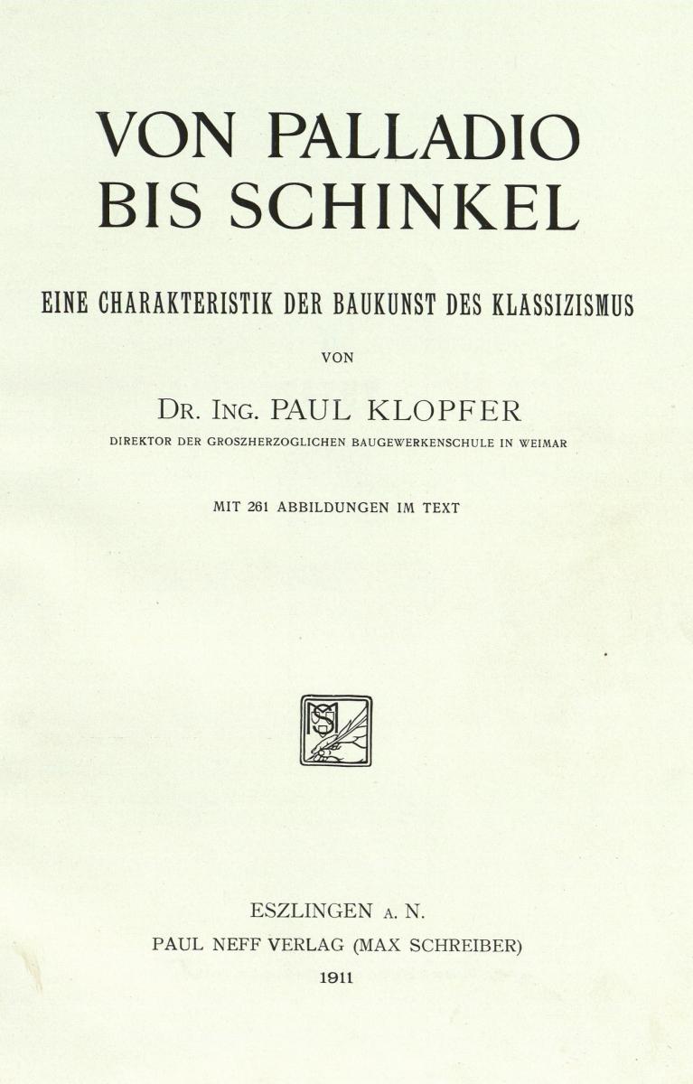Kniha Paula Klopfera o architektonickém klasicismu patří v záplavě literatury o tomto tématu ke skutečně kanonické literatuře, ačkoli není v bibliografii relevantních děl zmiňována. Neuvádí ji ani John Summerson ve své knize The Classical Language of Architecture, kupodivu ji nezmiňuje ani Hanno-Walter Kruft ve svých Geschichte der Architekturtheorie. Von der Antike bis zur Gegenwart. A přesto je svým širokým záběrem, faktografickou šíří a především popisem stavební typologie cenným příspěvkem k tématu architektonického klasicismu. Po vstupním teoretickém úvodě, kde se Klopfer zabývá pojmem klasicismus, po obecně historické části se věnuje stavebnímu klasicismu na území Itálie, Francie, Belgie a Holandska, Německa, Anglie, Španělska a Ruska. Není ovšem teritoriálně rigorózní, takže občas zvolí i jinou oblast, například je v knize fotografie pražské celnice od Georga Fischera, další Fischerova významná klasicistní stavba v Praze, která inspirovala Jože Plečnika, tedy kostel sv. Kříže, zde uvedena není. Výběr staveb je vymezen zhruba lety 1750–1850, ovšem s různými časovými posuny klasicismu v různých zemích Evropy. Cenná je dosud neprávem i odborníky podceňovaná kniha především svou stavební typologií, protože se právě z tohoto hlediska autor věnuje sakrálním stavbám v širokých historických souvislostech (např. předobrazy římského panteonu), divadelním stavbám, úředním budovám, nemocnicím, vojenským objektům, školám, knihovnám, muzeím, bankám, nádražím, obytným budovám, měšťanským domům, městským branám, zahradám a pomníkům. O to nepochopitelnější je pak absence nejprivilegovanějšího projevu palladianismu, pokud bychom chtěli všechny formy neoklasicismu redukovat na tento pojem, totiž vily. Vila jako stavební typ hraje v palladianismu zásadní roli nejen proto, že v cinquecentu patřila stavba vil vedle stavby paláců k nejpřednějším úkolům architekta a Palladia konkrétně, ale protože v horních společenských vrstvách v obdobích klasicismu cinquecenta, ale i v období 1750–1850, ztělesňoval tento stavební typ společensko-duchovní figuru, kterou bychom mohli nazvat procul negotiis, tedy dostatečný odstup od veřejného života, což bylo aktuální zejména v době bouřlivých společenských zvratů okolo roku 1848. Vila v této době představovala vysněné tusculum (původní proprium Tusculum se postupně proměnilo v apelativum tusculum), tedy onu společenskou tišinu, v níž se dařilo a daří intelektuální činnosti. Vila jako kulturně-historický a stavební typ prostě v této jinak podrobně typologicky zpracované knize není vůbec přítomna, pro což nelze najít žádné racionální vysvětlení. V této souvislosti je tedy třeba připomenout dva současné znalce vily jako kulturně-historického a stavebního typu, tedy Martina Kubelíka a Jamese Ackermana, jehož kniha The Villa: Form and Ideology of Country Houses patří k nejlepší literatuře na toto téma.