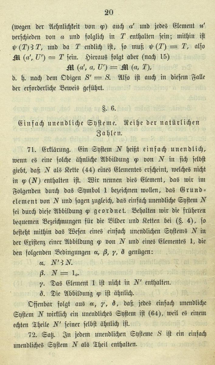 V druhém vydání Co jsou a co mají být čísla? se Dedekind zabývá nejen čísly, ale i nekonečnem. V § 5 s názvem Konečné a nekonečné podává definici nekonečna: „Systém S se nazývá nekonečným, je-li podobný vlastní části sebe sama; v opačném případě se nazývá S konečným systémem.“ Pojmu nekonečna předchází pojem systému, bez něhož by nekonečno nemohlo být objasněno. Systém vzniká tak, že „rozdílné věci označené jako a, b, c… chápané z nějakého společného hlediska v duchu shrneme a hovoříme pak o nich, že tvoří systém S; věci a, b, c… jsou prvky systému, jsou obsaženy v S a naopak S je tvořeno těmito prvky.“ Z vlastností systému pak můžeme dovodit, zda je S nekonečným, či naopak konečným systémem. Aby mohl vytvořit definici systému S a ten pak rozdělit na nekonečnou a konečnou soustavu, musel Dedekind ještě definovat podobnost, protože systém S je nekonečný pouze tehdy, je-li „podobný vlastní části sebe sama“. Podobnost je spojena s pojmem zobrazení, jež definuje Dedekind takto: „Zobrazením φ systému S se rozumí zákon, podle něhož ke každému určitému prvku s ze systému S přísluší určitá věc, která se nazývá obraz s a označená φ (s), říkáme rovněž, že φ (s) odpovídá prvku s, že φ (s) vzniká či je vytvořeno z s zobrazením, že s přechází do φ (s) zobrazením φ.“ Podobné zobrazení definuje Dedekind následovně: „Zobrazení φ systému S je podobné (nebo zřetelné), když rozdílným prvkům a, b, c… systému S odpovídají vždy rozdílné obrazy a´ = φ (a), b´= φ (b).“