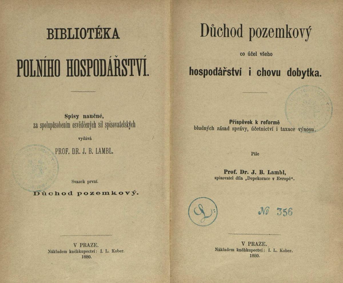 - LAMBL, J. B. Důchod pozemkový co účel všeho hospodářství i chovu dobytka: příspěvek k reformě bludných zásad správy, účetnictví i taxace výnosu. Praha: I. L. Kober, 1880. s. 125.