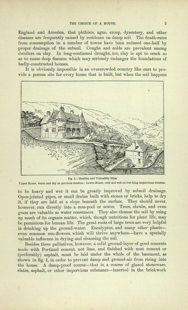 Velký důraz klade kniha na kvalitu půdy, kde dům stojí. Čím méně peněz se zaplatí landlordovi za laciný pozemek, tím více se později pravděpodobně zaplatí lékaři. Nejhorší je jílová půda, protože v sobě udržuje velké množství vody, která pak prosákne do stavení, jež bude vždy vlhké. Rovněž se upozorňuje na nutnost ověřit si, jací lidé jsou potenciální sousedé a co byl zač člověk, který zde bydlel před vámi, a jaké nemoci ho sužovaly. Dále se zde popisují celkové hygienické podmínky, jako umístění toalety, kvalita vody ve studni a předběžný průzkum stavu nemovitosti. Další kapitoly vysvětlují právní stránku věci, respektive práva a povinnosti obou stran při koupi nebo pronájmu nemovitosti nejprve v Anglii a pak ve Skotsku (kvůli drobným rozdílům v anglickém a skotském právu).