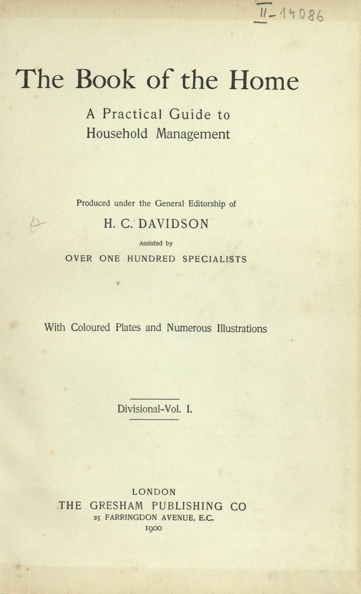 - DAVIDSON, H. C. The Book of the Home : a Practical Guide to Household Management. Divisional- Vol. I. London: Gresham, 1900. s. 1.