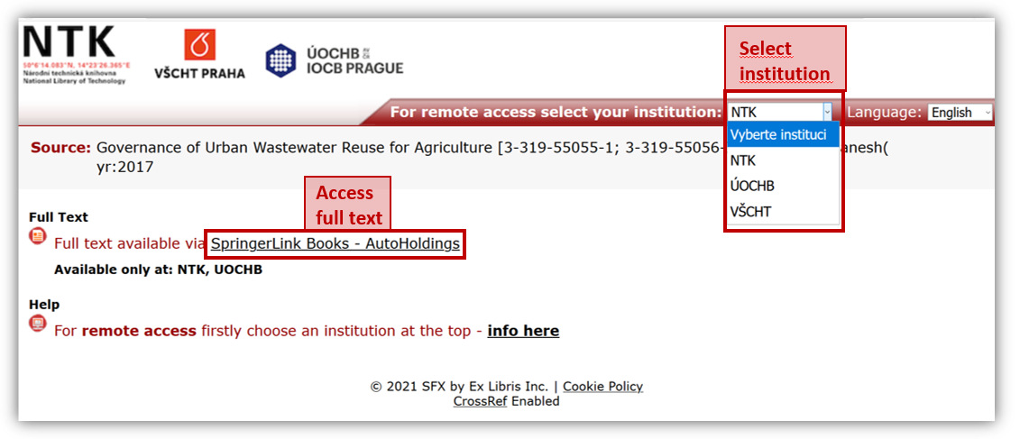 If you want to access full texts in the NTK collection, log in to My account at the top right of the main page with your username and password.