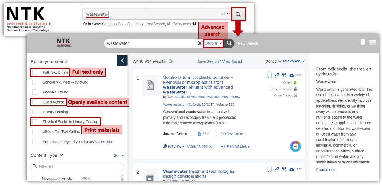 Use the search box at the top of every library web page to search NTK's print collection and electronic content (eBooks and eJournals) the library provides as well as openly available materials.
